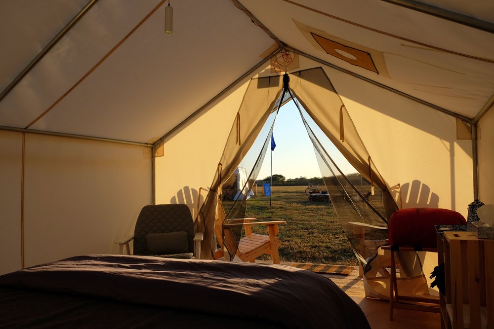 Each tent is furnished with a Queen-size bed featuring a memory foam mattress, side tables, solar lights, pillows, linens, extra blankets, towels, and extra cleaning supplies.