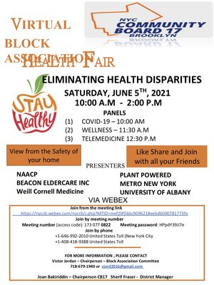 Brooklyn’s Community Board 17 is hosting a virtual health fair via Webex on Saturday, June 5th from 10 a.m. to 12 p.m.