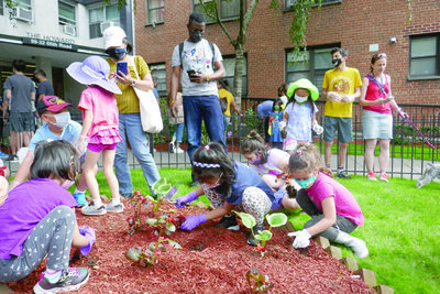 On June 18, approximately 50 volunteers helped landscape The Howard Apartments, a complex with large lawns and curved paths at at 66th Road and 102nd Street, reviving the concept of the community garden, which was once prevalent in the neighborhood.