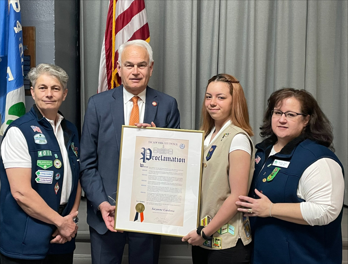 “A credit to the efforts of her parents, teachers, and Scout Leaders, she personifies the very best qualities of a Girl Scout and a member of our community,” he continued. “I was very happy to present this extraordinary young lady with a NYC Council proclamation. Our city needs more people like her.”