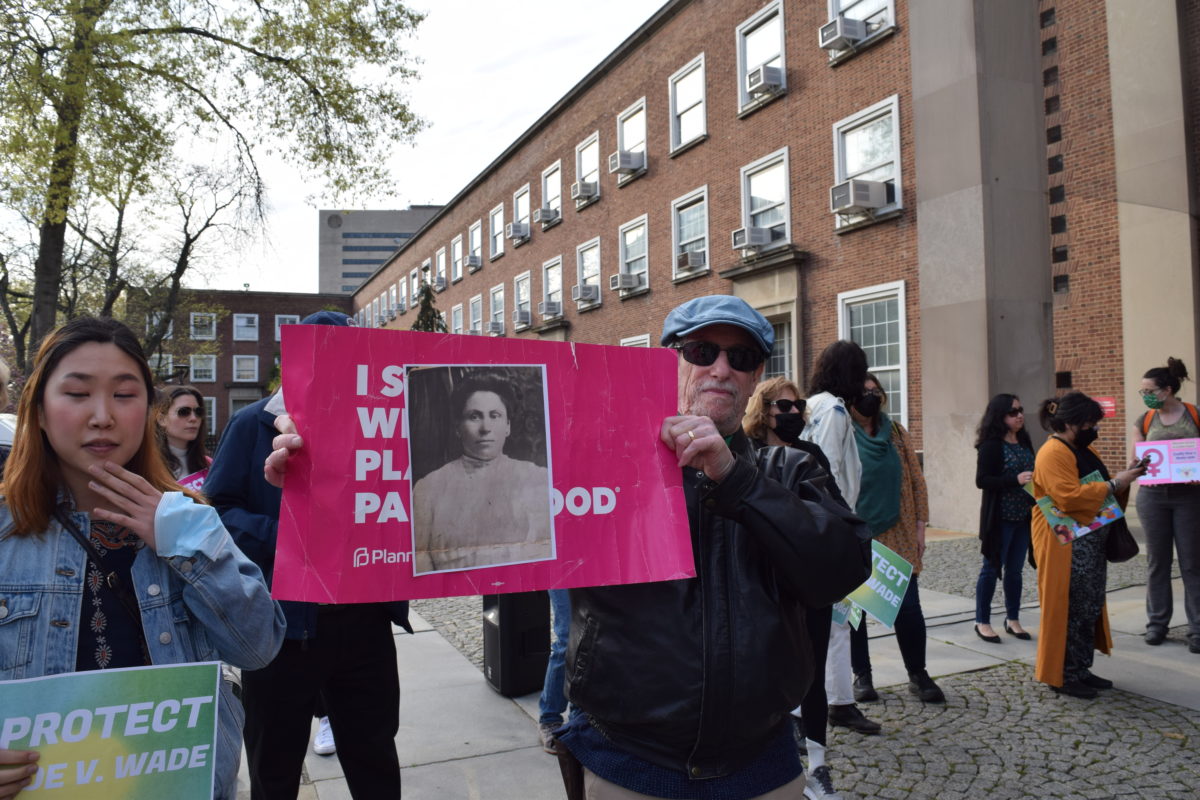 A Forest Hills resident holds up a sign with a photo of his grandmother, who died as a result of an unsafe abortion.