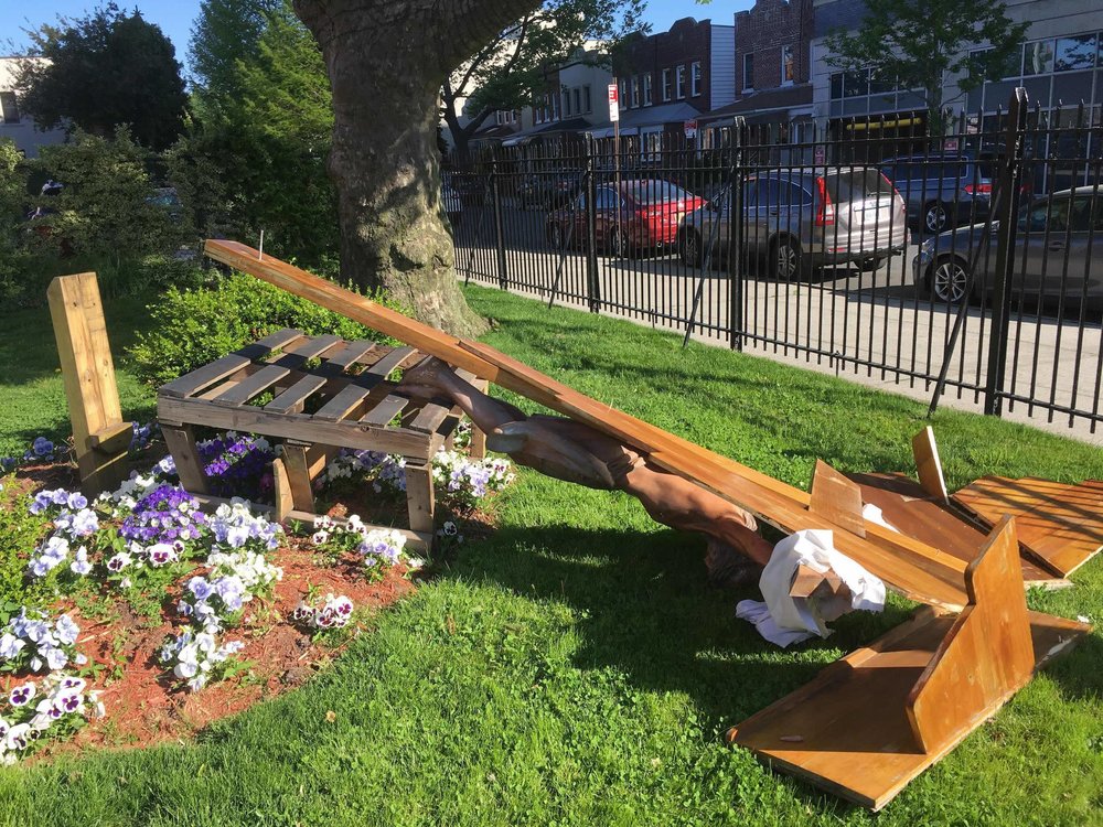In the early morning hours of May 14, a crucifix was toppled and damaged and an American Flag burned at St. Athanasius Roman Catholic Church in Bensonhurst.
