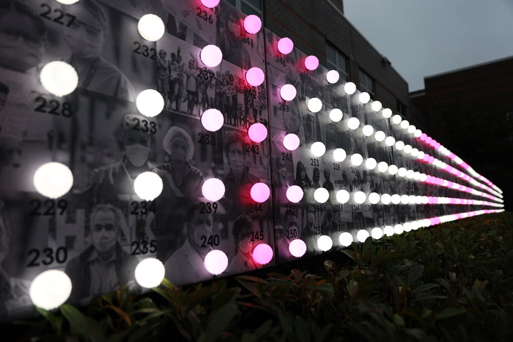 The first ten names on the 90-foot long installation are staff members from Elmhurst and Queens hospitals that passed away due to COVID-19. Integrated into the exhibit are photos of the community and hospital workers.