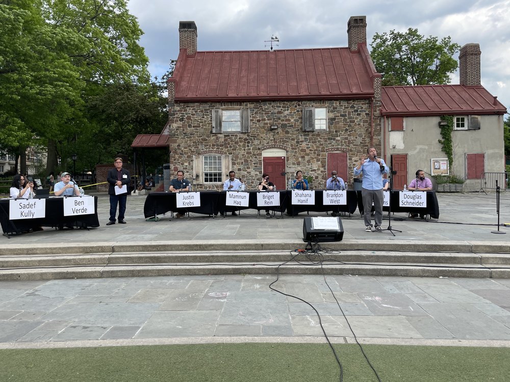 The candidates present at the forum event were Justin Krebs (nonprofit theater owner and political organizer), Mamnun Haq (cab driver, labor organizer, and public health advocate), Briget Rein (teacher, labor organizer, and member of Community Board 6), Shahana Hanif (activist and the current director of Community Engagement for Brad Lander), Brandon West (voting rights activist and City Hall budget staffer), Jessica Simmons (school principal), and Doug Schneider (civil rights attorney and Democratic district leader).